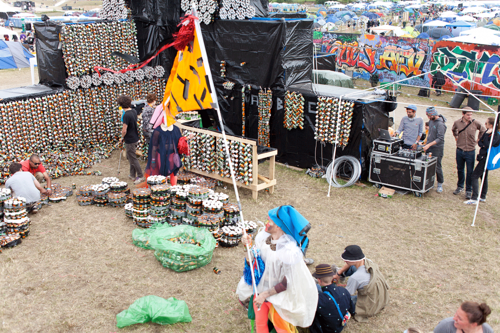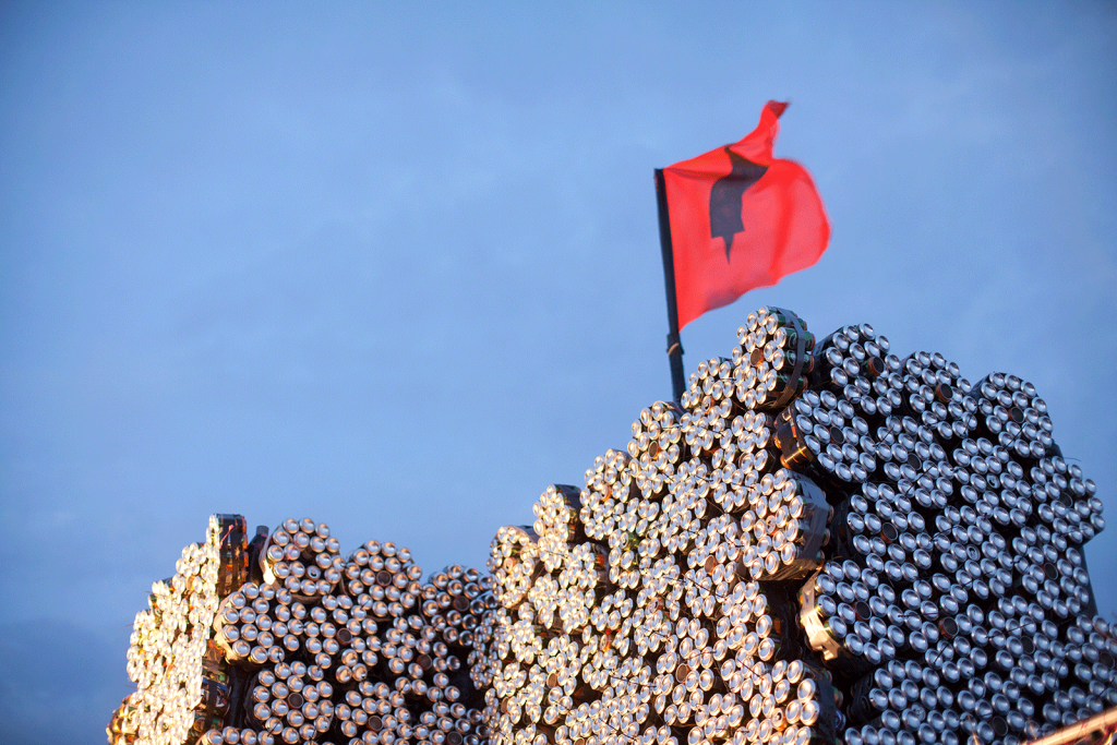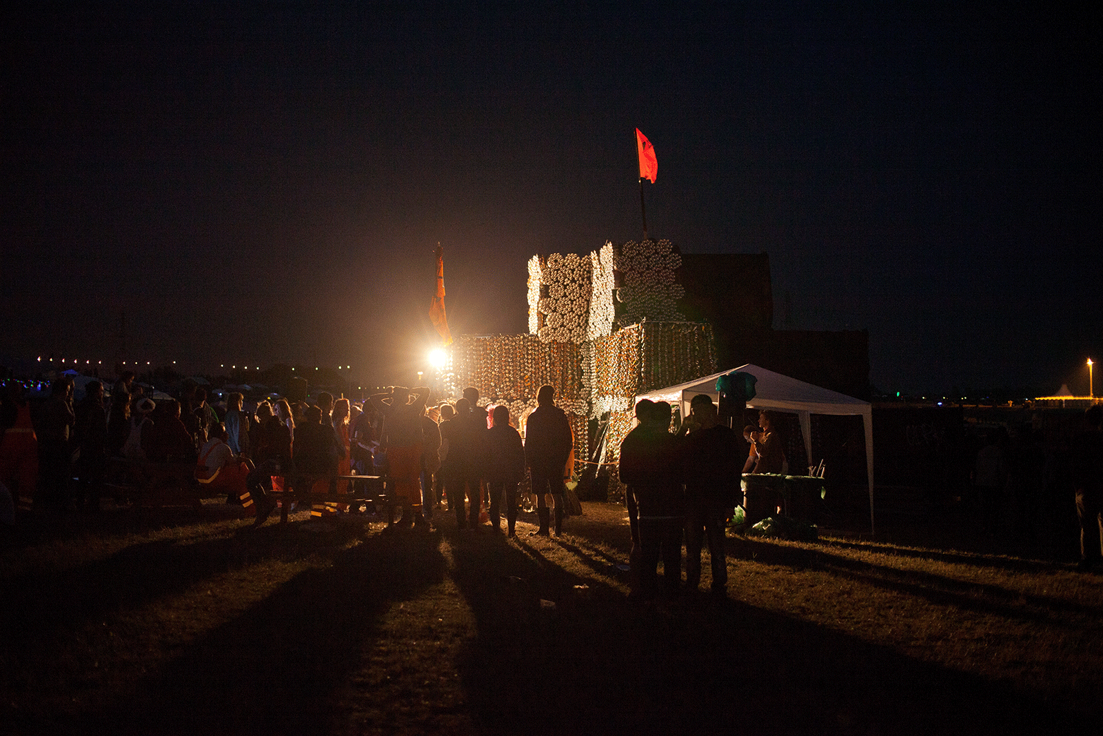 At the Roskilde Festival in 2013, Jeremy Wade and Miguel Gutierrez joined forces with the architectural collective Umschichten and costume designers Michiel Keuper and Anne Sophie Malmberg to create Maximum Service at the Church of Beer. Over four days, a team of more than thirty-five collaborators built a towering open-air church from recycled beer cans, staging mass dances, rituals, and raucous performances with thousands of festival-goers.